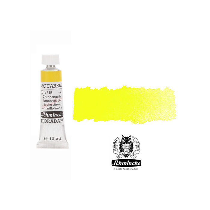Horadam Künstler-Aquarellfarben von Schmincke genießen weltweit höchstes Ansehen und sind Garant für beste Qualität. Das Sortiment lässt keine Wünsche offen. Die Aquarellfarben zeichnen sich durch eine besonders hohe Pigmentierung aus. Viele brillante Ein-Pigment-Töne sind ideal für ein gezieltes Ermischen von Farbe. Der Farbverlauf lässt sich leicht kontrollieren und natürlich haben die Farben eine sehr gute Anlösbarkeit. Die auf der Palette getrocknete Farbe kann immer wieder angelöst und vermalt werden. Die besten Künstlerpigmente in größtmöglicher Konzentration bieten auch die höchstmögliche Lichtechtheit. Eine Aquarellfarbe in der Tube ist zwar immer noch recht ungewöhnlich bietet aber auch Vorteile. So ist man nicht mehr auf einen starren Malkasten angewiesen der die Näpfchen festhält und kann sich die Farbe nach Belieben auf die Mischpalette aufbringen und dosieren. Auch zum Mischen ist es sehr angenehem die Pigmente direkt nebeneinander platzieren zu können und dann Wasser hinzuzugeben. Die Farbe in den Tuben wird nach der gleichen Rezeptur hergestellt wie die Farbe in den Näpfchen. Einen Qualitätsunterschied gibt es nicht. Zitronengelb ist das grünstichigste Gelb und die schwermetallfreie Alternative zum Kadmiumgelb zitron. Es hat gute Mal- und Mischeigenschaften. Mischungen mit Phthalogrün ergeben brillante Töne. Es ist der Basis-Gelbton für individuelle Ausmischungen. Es hat eine gute Lichtechtheit, ist halblasierend und lässt sich gut vom Papier anlösen.